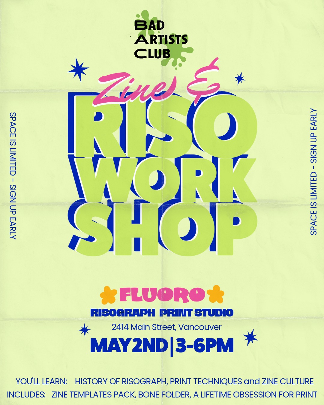 As a bonus, participants are invited to an optional day trip the week following the workshop. It’s a field trip exploring Vancouver’s DIY print scene, plus a digital goodie bag packed with templates, resources, and local zine directories to keep your practice rolling long after the ink dries.